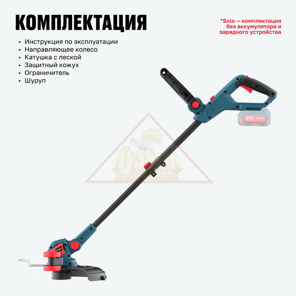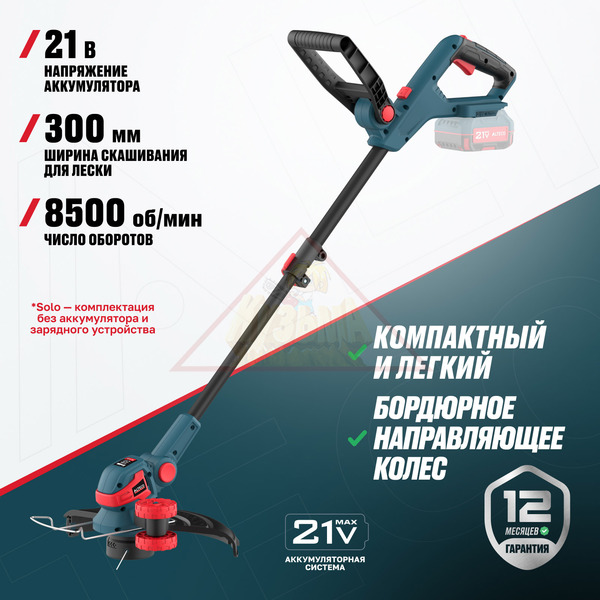 Аккумуляторный триммер ALTECO CT 21-30 Solo (без АКБ и ЗУ) предназначен для быстрой и точной стрижки травы на небольших участках, вдоль бордюров, клумб и в труднодоступных местах. Лёгкий, компактный и удобный в управлении, он отлично подходит для садовых работ без лишней нагрузки. Работает от аккумулятора 21Vmax ALTECO (от 2 до 5 А·ч), обеспечивая свободу от розеток и полную мобильность. Нижнее расположение мотора гарантирует отличную балансировку: масса головки компенсируется весом батареи и задней рукоятки.