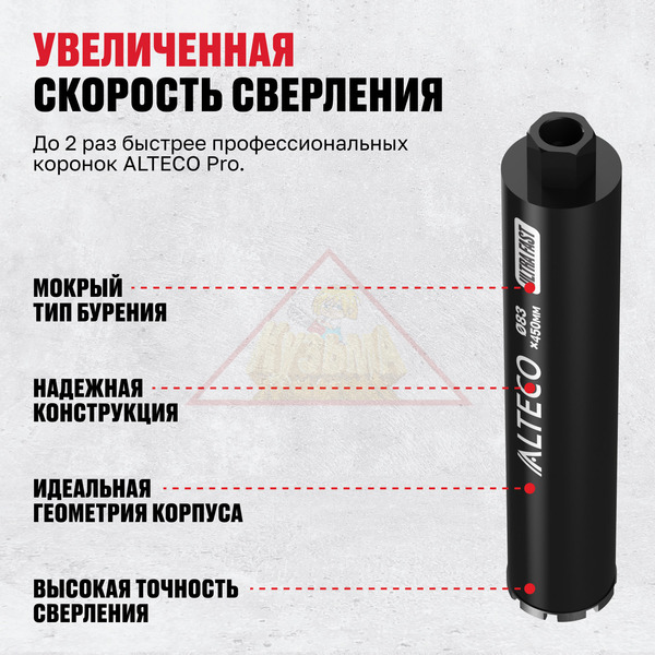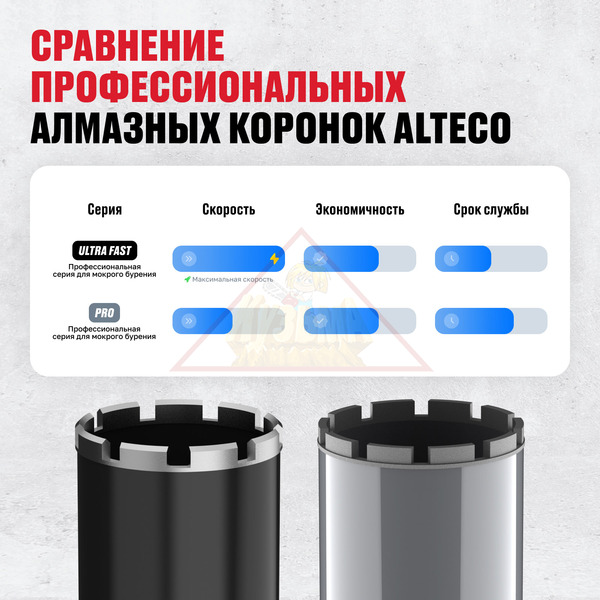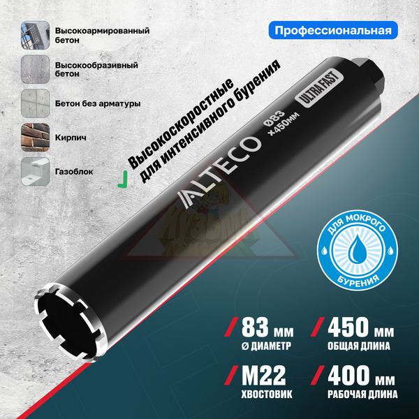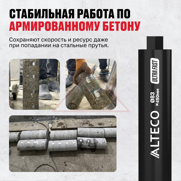 Алмазные коронки ALTECO Ultra Fast профессиональные алмазные коронки, созданные для максимально быстрой работы по бетону, кирпичу и камню. Используются при мокром бурении, что снижает перегрев и продлевает срок службы инструмента. Подходят для интенсивной эксплуатации на строительных объектах и при монтаже инженерных систем.