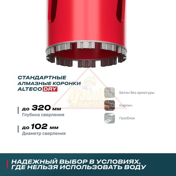 Алмазные коронки ALTECO DRY стандартная серия для сухого сверления. Предназначены для работы с бетоном и кирпичом в условиях, где нельзя использовать воду, например, в жилых помещениях или на высоте. Такой подход позволяет избежать лишней грязи, упрощает уборку и делает процесс более удобным.