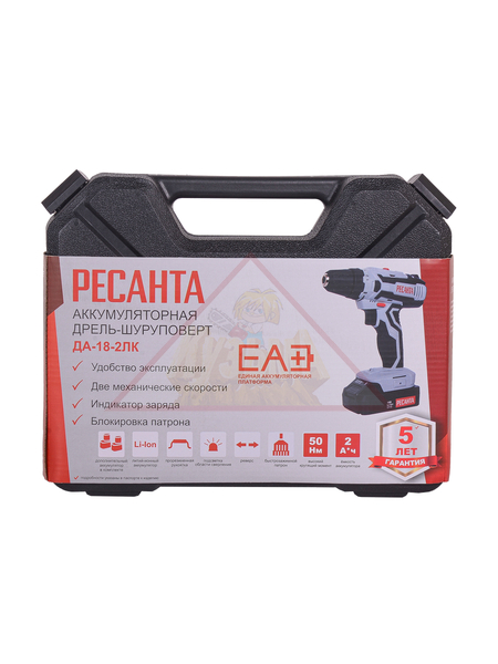Дрель-шуруповерт Ресанта ДА-18-2ЛК имеет удобную пистолетную конструкцию. Слайдерный тип крепления аккумуляторов обеспечивает простоту их замены. Диаметр патрона варьируется от 0,8 до 10 мм, что позволяет использовать разнообразную оснастку. Реверсный ход предназначен для выкручивания крепежей. При работе в труднодоступных местах и при слабом освещении используется функция подсветки. В комплектацию входят набор из 6 основных бит и адаптер-удлинитель, позволяющие сразу приступить к использованию инструмента. Прочный пластиковый кейс обеспечивает удобство и безопасность хранения и транспортировки.