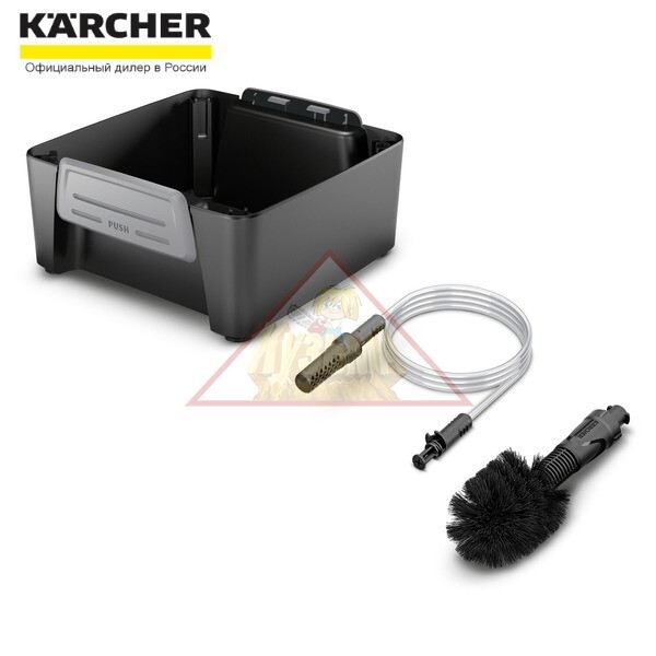 Контейнер с принадлежностями для очистки дорожного инвентаря с помощью портативной мойки Karcher OC 3. Легко закрепляется на корпусе мойки, подходит для тех, кто проводит много времени в путешествиях. В комплект входит универсальная щетка для удаления стойких загрязнений и всасывающий шланг для отбора воды из колодцев, канистр и других емкостей.